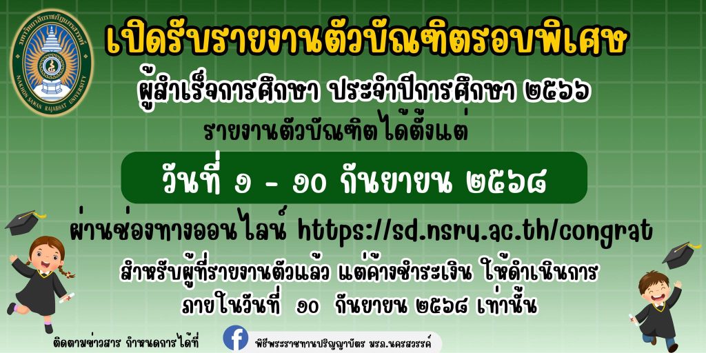 รายงานตัวบัณฑิตได้ที่ https://sd.nsru.ac.th/congrat/